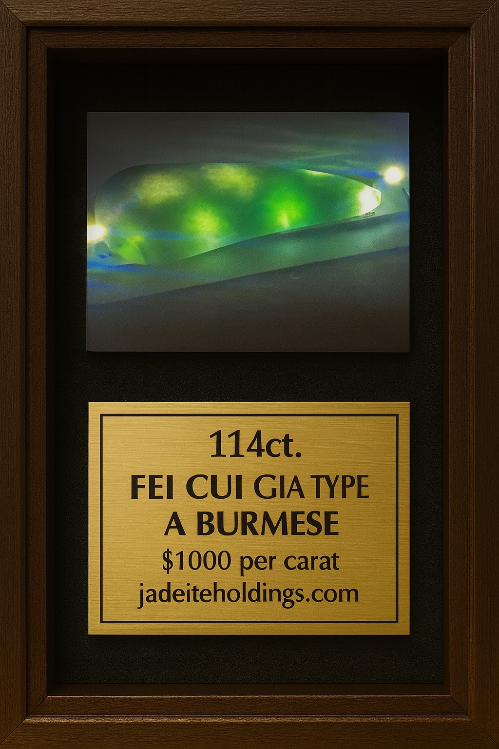 BLACK FRIDAY SALE 114-carat Burmese Fei Cui (Jadeite), GIA Type A (untreated) • Freeform cabochon • Medium-to-high translucency with strong internal glow • Variegated green and gray “flowering” pattern • Old-mine Burmese origin Market Analysis: Translucent, untreated Burmese jadeite of significant size remains rare and highly sought after in Asian and international gemstone markets. Variegated green zones with internal light transmission place this specimen above commercial-grade material and within the mid–high collector band. Valuation Basis: • Market rate for translucent Type A variegated Burmese jadeite: $600–$1,200 per carat • Applied valuation rate: $1,000 per carat (supported by current Hong Kong/Singapore dealer pricing and auction comparables) Final Valuation: 114 carats × $1,000 per carat = $114,000 USD Asian Market Premium: Asian wholesale: $135,000–$160,000 USD Asian retail showcase: $175,000–$225,000 USD