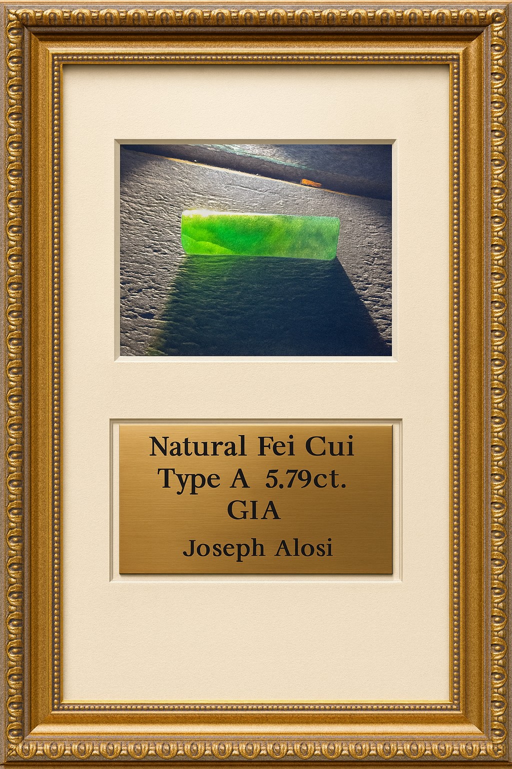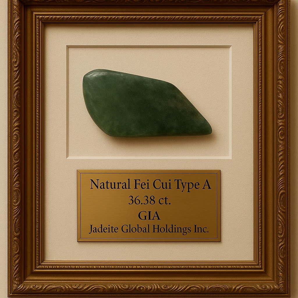 This 19.95-carat Natural Fei Cui (Type A) jadeite cabochon displays a beautifully mottled blend of soft green tones with smooth translucency characteristic of untreated Burmese jadeite. Its freeform, geometric silhouette highlights the natural flow of the material, giving it a modern, sculptural presence while preserving the organic veining and depth within the stone. Mounted in an elegant museum-style frame with a gold plaque, the piece presents as a refined collectible—clean, icy, and naturally vibrant—reflecting the high quality and authenticity confirmed by its GIA Type A designation.